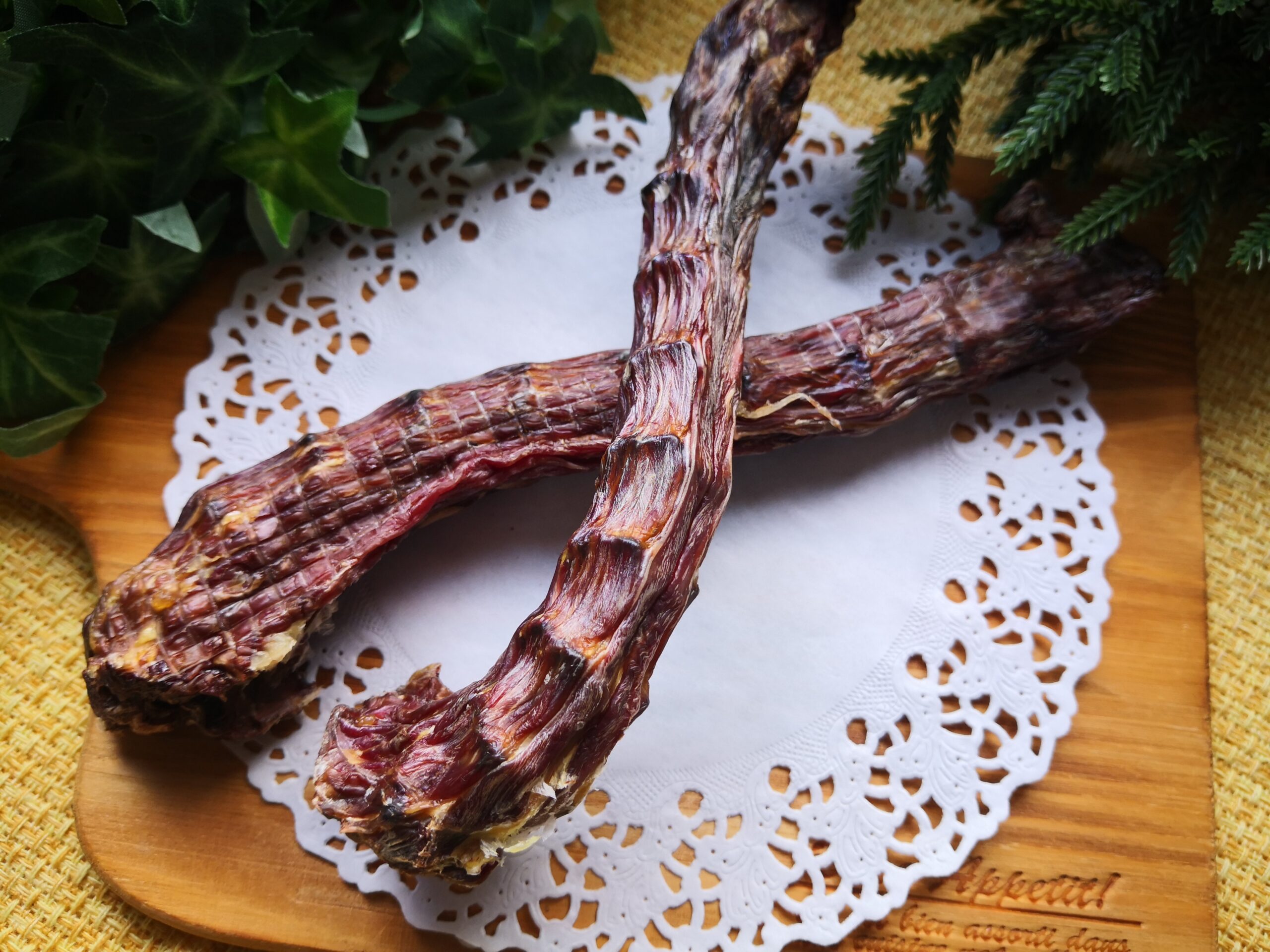 鴨の首を低温長時間掛けて水分を抜き取り乾燥させてあります。