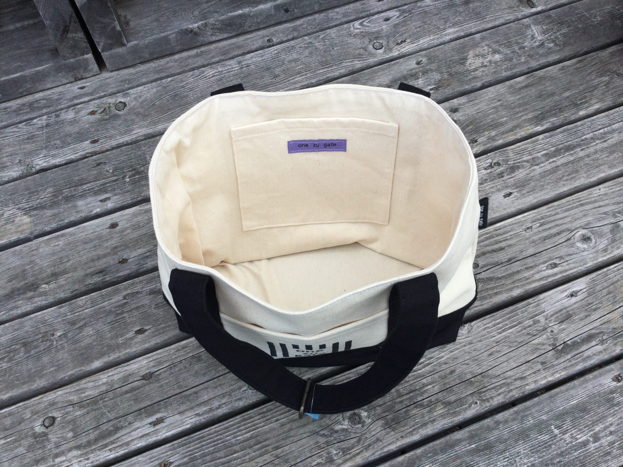 しっかりした帆布生地で大容量!外側と内側にポケット付き!取っ手にはリングも付いているので