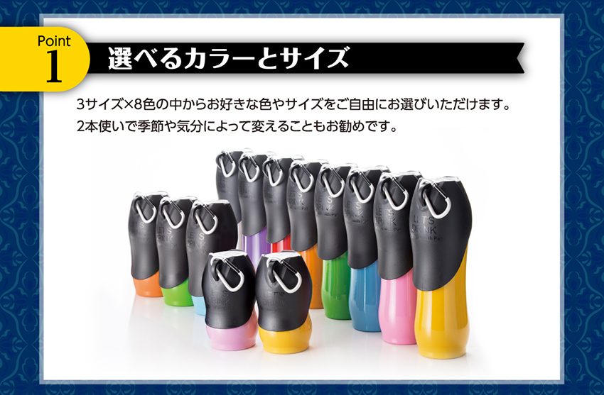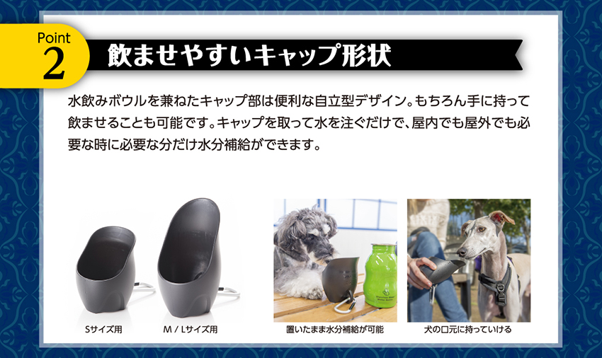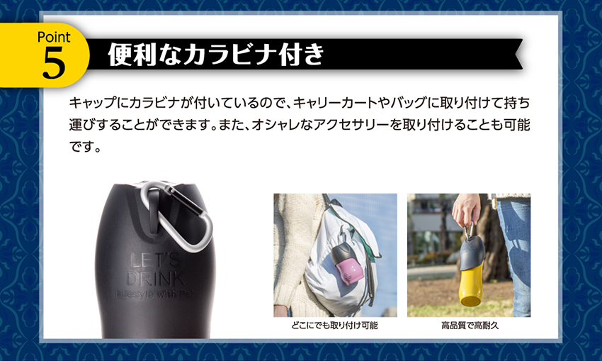 飲ませやすいキャップ形状。便利なカラビナ付き。
